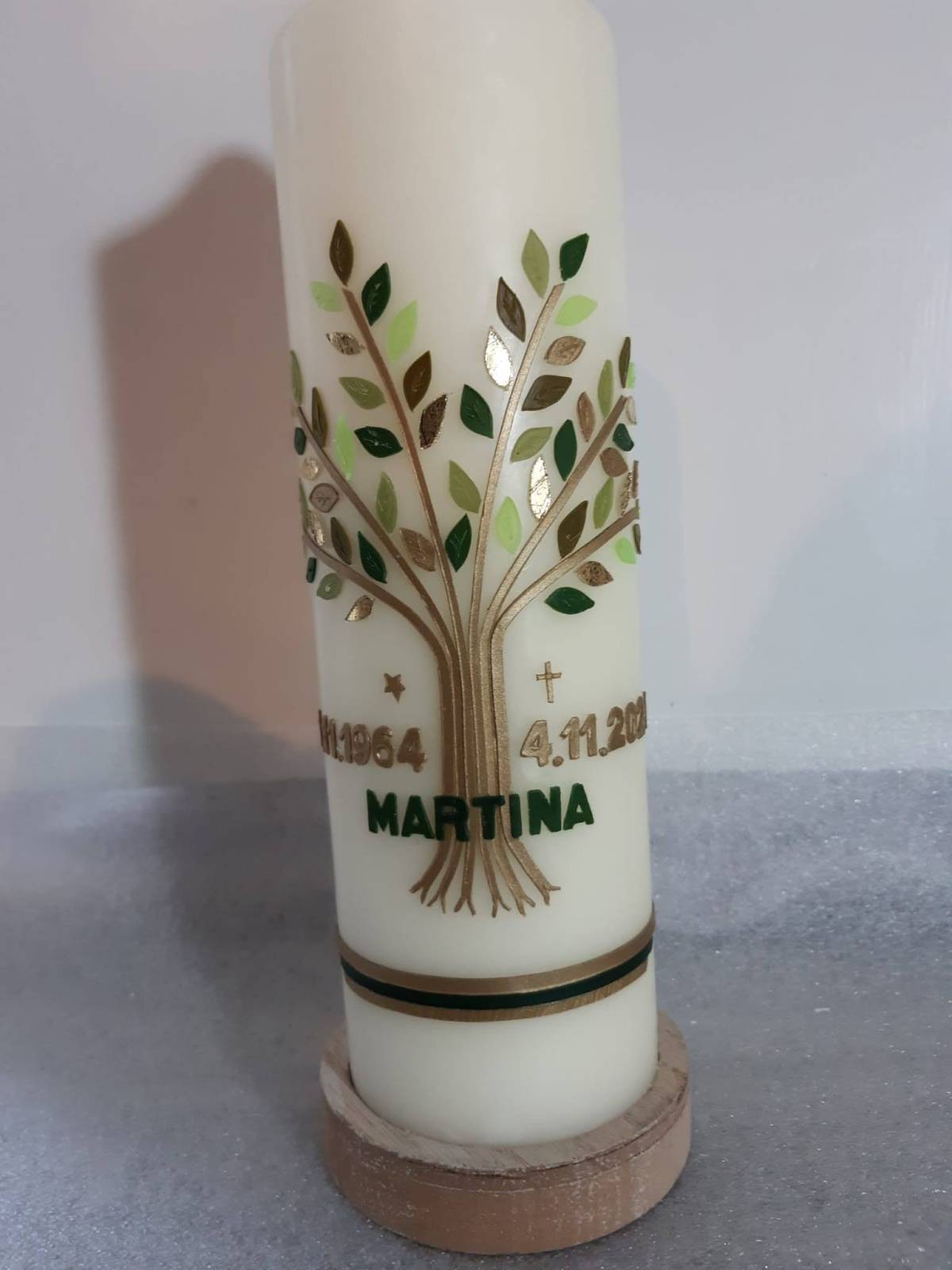 Eine Trauerkerze, die in ihrer besonderen Ausgestaltung, z.B. mit Kreuz, Sonne, Bändern, Blättern, Alpha/Omega Zeichen, vielleicht auch mit dem Namen des Verstorbenen, an ihn erinnert.